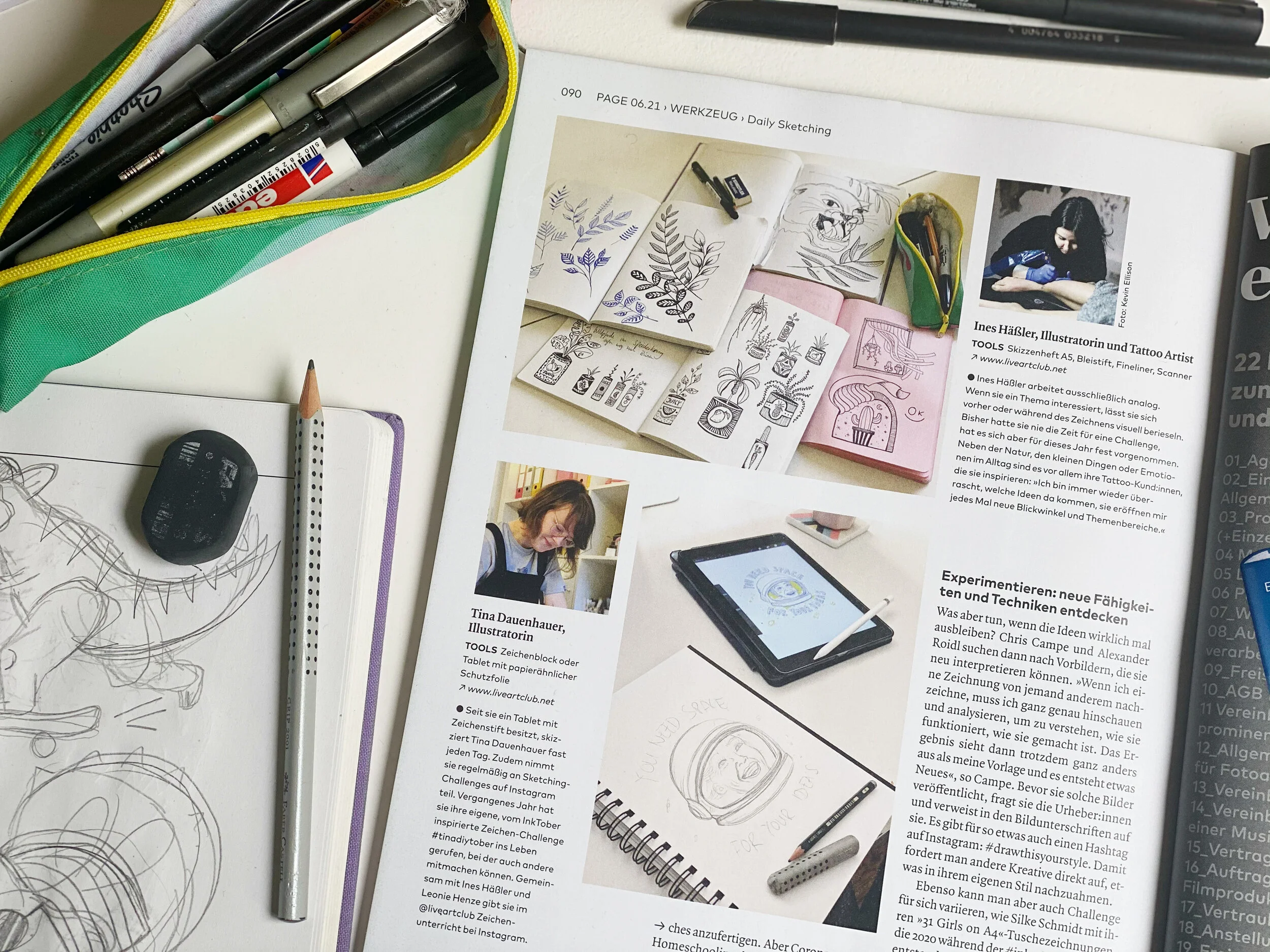 Zum Thema “Daily Sketching: Tipps & Challenges”, hat uns die PAGE eingeladen Teil eines Artikels zu sein. Neben vielen anderen fantastischen Künstler:innen, haben Tina & Ines Einblicke in ihre Scribble-Routine und Skizzenhefte gegeben.