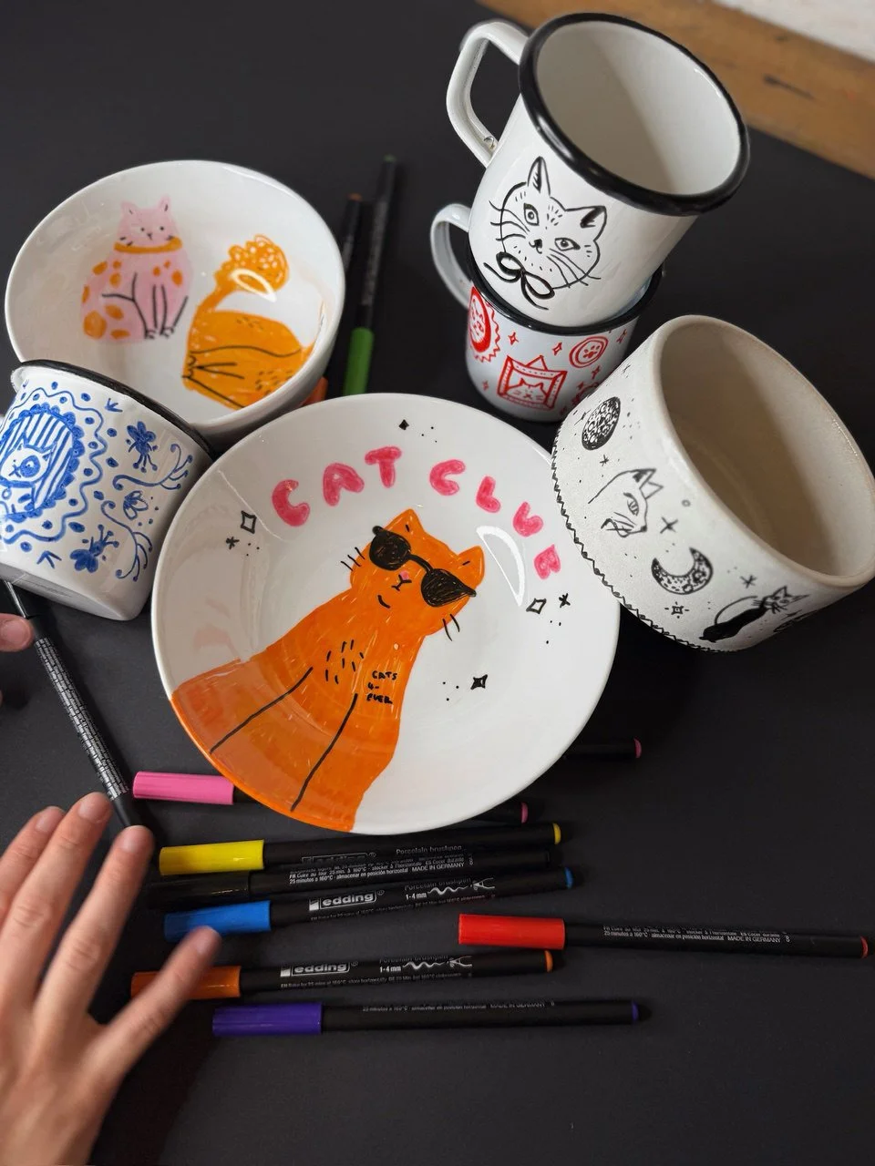 Am Eröffnungswochenende der neuen Ausstellung “Katzen!” im MARKK Museum am Rothenbaum in Hamburg veranstalten wir einen kostenlosen Upcycling Workshop für alle Besucher:innen. Kommt vorbei & bringt euer altes Geschirr und Keramik mit - wir zeigen euch, wie ihr eure Tassen, Teller und Becher zu bunten Unikaten mit verschiedenen Katzenmotiven bemalt.